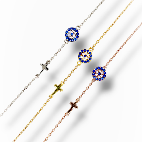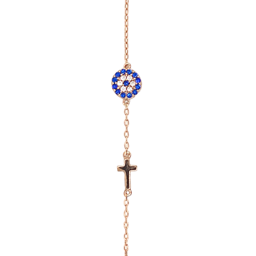 Βραχιόλι evil eye από ασήμι 925 με πλαινο μικρο σταυρό. Το μήκος είναι ρυθμιζόμενο από 16 cm έως 18,5 cm Η διάμετρος του ματιού είναι 6,4 mm